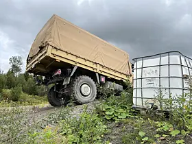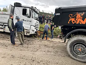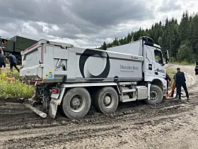 Selv om kjøringen foregikk i kontrollerte former, var en sjåfør uheldig og fikk hjulene utenfor løypa og satte en av Arocsene grundig fast.
