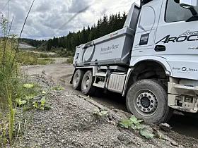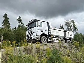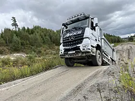 Deltakerne fikk også prøve Arocs tippbil med last i terrengbanen. En med vanlig clutch og en med turbo retarder clutch - les mer om sistnevnte her.