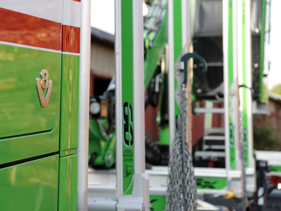 Totalt kan han nå laste 38 tonn – 11 på bilen og 27 på hengeren – for å komme opp i totalvekt på 60 tonn på det 24 meter lange settet. Den nye 650-hesters åtteren fra Södertälje kan han ikke få fullrost.