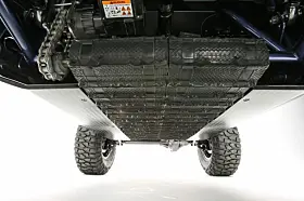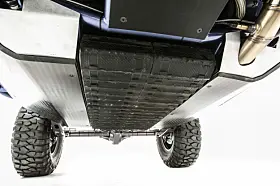 Men la oss få med den virkelige finessen. Det ser jo ut som om bilen er høy nok til å gå fri av de fleste hindringer, men hvis noe kommer i veien har Toyota montert et belte fra en tanks på undersiden.