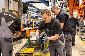 MANs toppsjef Alexander Vlaskamp og produksjonsdirektør Michael Kobriger markerte oppstarten sammen med EU-parlamentariker Manfred Weber ved fabrikken i München.