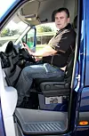 Førermiljøet i Crafter er luftig, og selv røslige karer finner god plass. Testbilen har fått komfortførersete og armlene, og det mangler heller ikke mange på smarte løsninger eller koppholdere i bilen. Likevel er følelsen merkelig spartansk – det er så jeg overraskes av elektriske vindusheiser!