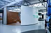 Organiske kurver, hvitt som fargevalg og naturlige materialer symboliserer CO2-nøytral veigodstransport. Den frittstående, selvbærende showrommet utmerker seg med sin bærekraftige trekonstruksjon og skiller seg ut allerede utvendig med sin runde form, i kontrast til det mer konvensjonelle rektangulære kundesenteret.