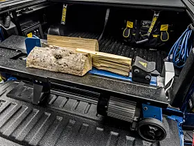 Praktisk å kunne kappe og kløyve for deretter å hive arbeidet rett på planet når hyttevedhugsten ikke foregår innenfor el-nettets rekkevidde. Baklemmen har jo akkurat rett høyde for en enkel vedkløyver.