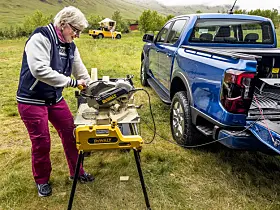 Trengs det strøm til ulike redskaper har Ford utstyrt ladehybride Ranger med 10 A uttak inne i bilen og to 15 A arbeidsuttak på venstre side av planet.