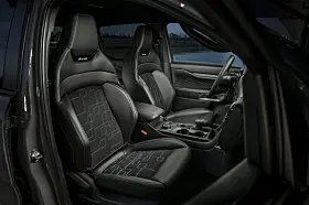 Også her er det nye seter med mer sidestøtte, kledd i «vegansk skinn» og alcantara med MS-RT mønster og blå sømmer med logo foran og på dashbordet. Sportsrattet er også merket med MS-RT.