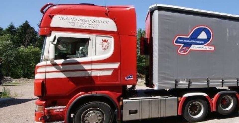 Bildet under: Lastebileier Nils Kristian Saltveit er en av ildsjelene bak prosjektet til støtte for norske yrkessjåfører. Han har dekortert to av trallene sine med store utgaver av merkene.