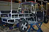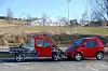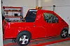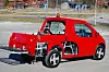 Man skulle tro dette var nok å gjøre for 8 ansatte, men nei da. På fritiden tok de en rød bil, kuttet den bak B-stolpen, forlenget den «nok til at vi kunne bygge et plan med plass til en Euro-pall pluss to kasser danske bayere», og mekket til et slags karosseri bak der.