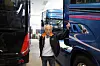 Det første som møter oss inne i ombyggingshallen er to Scania R-serie trekkvogner i en særegen blåfarge med rosa (magenta), svarte og sølvfargede dekorstriper. En hyllest til 90-tallets Scania-modeller.